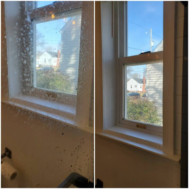 Before and after of a glass shower door.